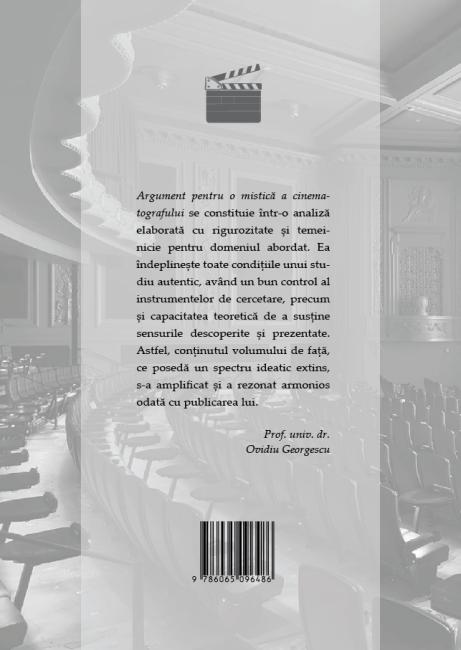 Argument pentru o mistică a cinematografului se constituie într-o analiză elaborată cu rigurozitate și temeinicie pentru domeniul abordat. Ea îndeplinește toate condițiile unui studiu autentic, având un bun control al instrumentelor de cercetare, precum și capacitatea teoretică de a susține sensurile descoperite și prezentate. Astfel, conținutul volumului de față, ce posedă un spectru ideatic extins, s-a amplificat și a rezonat armonios odată cu publicarea lui. (Prof. univ. dr. Ovidiu Georgescu)