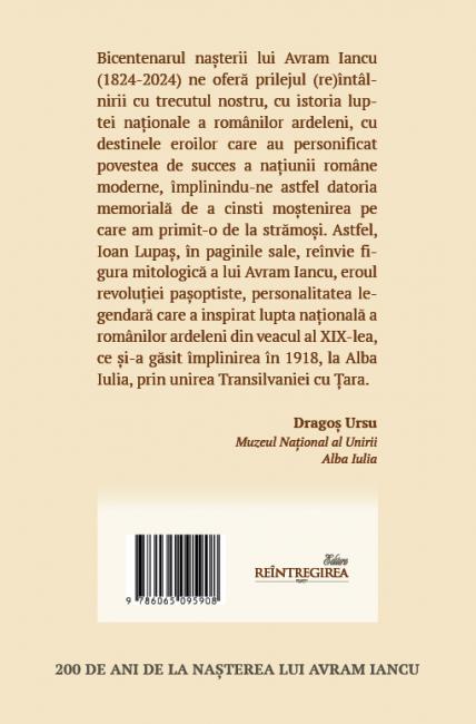 Bicentenarul nașterii lui Avram Iancu (1824-2024) ne oferă prilejul (re)întâlnirii cu trecutul nostru, cu istoria luptei naționale a românilor ardeleni, cu destinele eroilor care au personificat povestea de succes a națiunii române moderne, împlinindu-ne astfel datoria memorială de a cinsti moștenirea pe care am primit-o de la strămoși. Astfel, Ioan Lupaș, în paginile sale, reînvie figura mitologică a lui Avram Iancu, eroul revoluției pașoptiste, personalitatea legendară care a inspirat lupta națională a românilor ardeleni din veacul al XIX-lea, ce și-a găsit împlinirea în 1918, la Alba Iulia, prin unirea Transilvaniei cu Țara. (Dragoș Ursu - Muzeul Național al Unirii Alba Iulia)