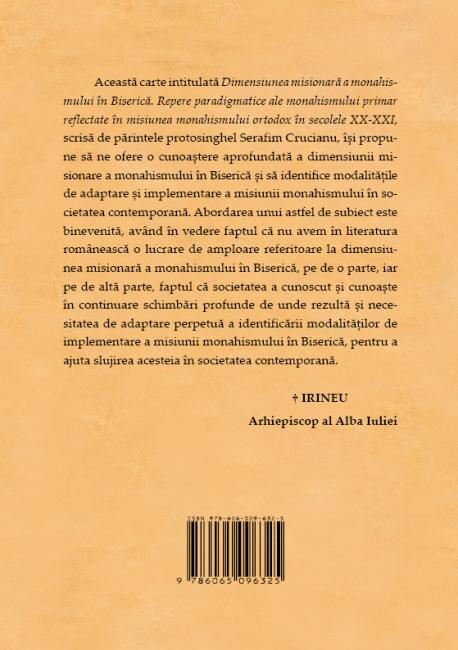 Această carte intitulată Dimensiunea misionară a monahismului în Biserică. Repere paradigmatice ale monahismului primar reflectate în misiunea monahismului ortodox în secolele XX-XXI, scrisă de părintele protosinghel Serafim Crucianu, își propune să ne ofere o cunoaștere aprofundată a dimensiunii misionare a monahismului în Biserică si să identifice modalitățile de adaptare și implementare a misiunii monahismului în societatea contemporană. Abordarea unui astfel de subiect este binevenită, având în vedere faptul că nu avem în literatura românească o lucrare de amploare referitoare la dimensiunea misionară a monahismului în Biserică, pe de o parte, iar pe de altă parte, faptul că societatea a cunoscut și cunoaște în continuare schimbări profunde de unde rezultă și necesitatea de adaptare perpetuă a identificării modalităților de implementare a misiunii monahismului în Biserică, pentru a ajuta slujirea acesteia în societatea contemporană. († IRINEU, Arhiepiscop al Alba Iuliei)