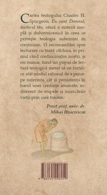 Cartea teologului Charles H. Spurgeon, Eu sunt Domnul, doctorul tău, oferă o sinteză simplă și duhovnicească în ceea ce privește teologia suferinței în creștinism. O recomandăm spre lecturare cu toată căldura, în primul rând credincioșilor noștri, si nu numai, fiind un popas de lectură teologică menit să ne fortifice atât modul rațional de a percepe suferința, cât și persistența în harul unei credințe asumate, indiferent de etapele și încercările vieții prin care trecem (Preot prof. univ. dr. Mihai Himcinschi)