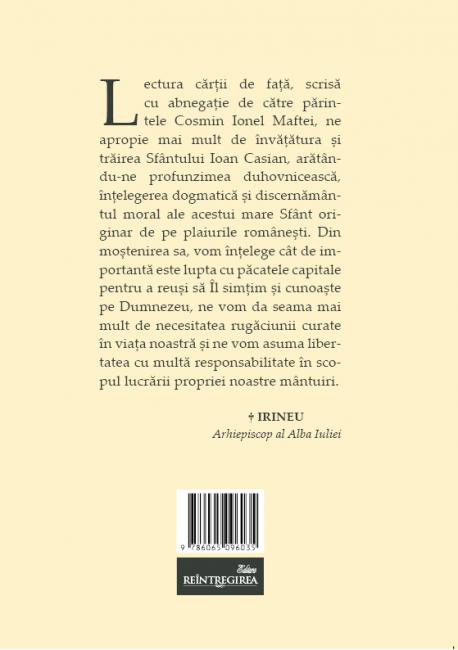 Lectura cărții de față, scrisă cu abnegație de către părintele Cosmin Ionel Maftei, ne apropie mai mult de învățătura și trăirea Sfântului Ioan Casian, arătându-ne profunzimea duhovnicească, înțelegerea dogmatică și discernământul moral ale acestui mare Sfânt originar de pe plaiurile românești. Din moștenirea sa, vom înțelege cât de importantă este lupta cu păcatele capitale pentru a reuși să îl simțim și cunoaște pe Dumnezeu, ne vom da seama mai mult de necesitatea rugăciunii curate în viața noastră și ne vom asuma libertatea cu multă responsabilitate în scopul lucrării propriei noastre mântuiri. († IRINEU, Arhiepiscop al Alba Iuliei)