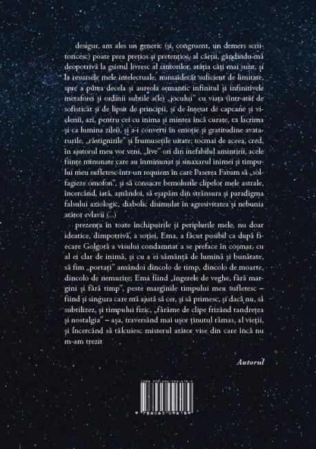desigur, am ales un generic (și, congruent, un demers scriitoricesc) poate prea prețios și pretențios, al cărții, gândindu-mă deopotrivă la gustul livresc al cititorilor, atâția câți mai sunt, și la resursele mele intelectuale, numaidecât suficient de limitate, spre a putea decela și aureola semantic infinitul și infinitivele metaforei și ordinii subtile a(le) „jocului” cu viața (într-atât de sofisticat și de lipsit de principii, și de înțesat de capcane și viclenii, azi, pentru cei cu inima și mintea încă curate, ca lacrima și ca lumina zilei), și a-i converti în emoție și gratitudine avatarurile, „răstignirile” și frumusețile uitate; tocmai de aceea, cred, în ajutorul meu vor veni, „live” ori din inefabilul amintirii, acele ființe minunate care au înminunat și sinaxarul inimei și timpului meu sufletesc-într-un requiem în care Paserea Fatum să „solfagieze omofon”, și să consacre bemolurile clipelor mele astrale, încercând, iată, amândoi, să eșapăm din strânsura și paradigma falsului axiologic, diabolic disimulat în agresivitatea și nebunia atâtor evlavii (...)