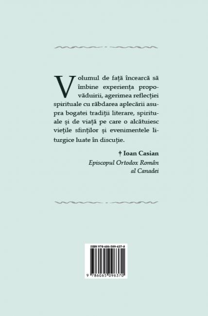 Volumul de față încearcă să îmbine experiența propovăduirii, agerimea reflecției spirituale cu răbdarea aplecării asupra bogatei tradiții literare, spirituale și de viață pe care o alcătuiesc viețile sfinților și evenimentele liturgice luate în discuție. († Ioan Casian, Episcopul Ortodox Român al Canadei)