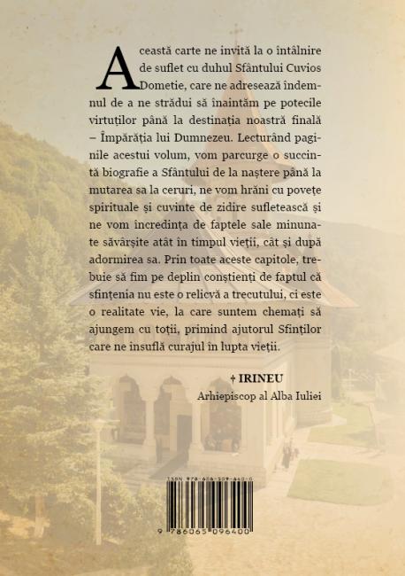 Această carte ne invită la o întâlnire de suflet cu duhul Sfântului Cuvios Dometie, care ne adresează îndemnul de a ne strădui să înaintăm pe potecile virtuților până la destinația noastră finală – Împărăția lui Dumnezeu. Lecturând paginile acestui volum, vom parcurge o succintă biografie a Sfântului de la naștere până la mutarea sa la ceruri, ne vom hrăni cu povețe spirituale și cuvinte de zidire sufletească și ne vom încredința de faptele sale minunate săvârșite atât în timpul vieții, cât și după adormirea sa. Prin toate aceste capitole, trebuie să fim pe deplin conștienți de faptul că sfințenia nu este o relicvă a trecutului, ci este o realitate vie, la care suntem chemați să ajungem cu toții, primind ajutorul Sfinților care ne insuflă curajul în lupta vieții. († IRINEU, Arhiepiscop al Alba Iuliei)
