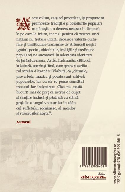 Acest volum, ca și cel precedent, își propune să promoveze tradițiile și obiceiurile populare românești, un demers necesar în timpurile pe care le trăim, tocmai pentru că zestrea unei națiuni nu trebuie uitată, deoarece valorile culturale și tradiționale transmise de strămoșii noștri (graiul, portul, obiceiurile, tradițiile și credințele populare) ne ancorează în adevărata identitate de țară și de neam. Astfel, îndemnăm cititorul la lectură, convinși fiind, cum spune și scriitorul român Alexandru Vlahuță, că „datinile, proverbele, muzica și poezia sunt arhivele popoarelor, iar cu ele se poate constitui trecutul lor îndepărtat. Căci nu există bucurii mai de preț ca averea de cuget și simțire inclusă și păstrată cu sfântă grijă de-a lungul vremurilor în adâncul sufletului românesc, al moșilor și strămoșilor noștri” (Autorul).